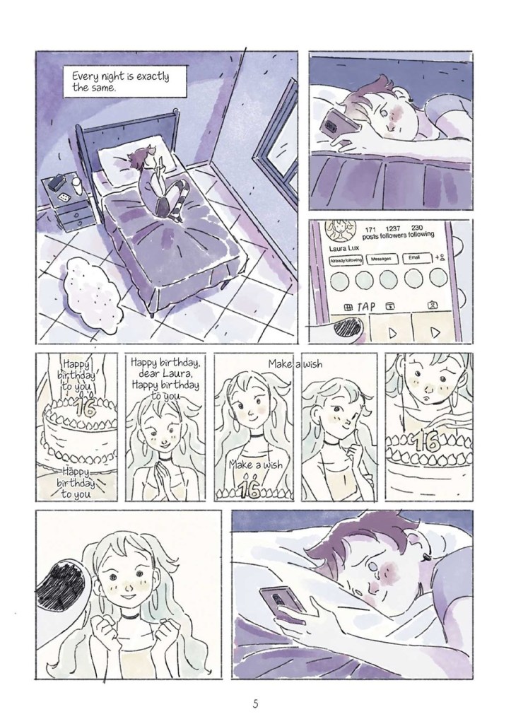 Imagine having your heart broken and waking up in a hotel that will give you time to live inside your head; to weave your own illusions that help you cope. Heartbreak Hotel tells the stories of four teens, each experiencing heartbreak; it’s time to check out of the hotel, though, and to do that, they must find one another, witness their stories, and move on. While each one suffers from some kind of loss, you’ll see that losses don’t always equate a death. Two-color watercolor washes define each character’s present; brighter watercolors bring readers to the past, giving memories a livelier tint; usually, it’s the memories that are subdued. Characters include a girl mourning the love of her life; a girl who never wants to grow up; a boy whose Instagram filters tell the story he wants people to see, and a boy who just wants to stop. Alice in Wonderland nods run throughout the story: the four playing card suits; a caterpillar, and a rabbit all appear, as does a plastic cat named Neko, who acts as one character’s guide to the hotel. Themes touch on grief, moving on, memory, and self-esteem. A good pick for social-emotional collections.