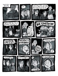 Wickey worked on this book for a decade, and the labor of love comes through. Centered in Salem, the heart of the story lies with Giles Corey, who famously demanded “more weight” as he was pressed to death during the Salem Witch Trials. We don’t get a rosy picture of Corey, who was neither good nor kind; he is altogether human and flawed, as are most of the people in Salem, from the men making decisions on murdering women to the young girls who feigned being under attack, sending women to their deaths. With this event serving as the story’s nucleus, Wickey builds the history of Salem and the American ability to turn the most gruesome of events into pop culture phenomena. We meet the ghosts of Nathaniel Hawthorne and Henry Wadsworth Longfellow, who hold thoughtful conversations as they stroll Salem’s streets, and we see modern-day Salem as a hub for witchcraft aficionados and Hocus Pocus fans: but do they understand, truly understand, what happened there? Wickey’s thoughtful dialogue may make readers take another look at the merchandising of the Salem Witch Trials and come away with a more sobering outlook. Illustrations go between a woodcut look for Corey’s tale and more realistic artwork for Hawthorn, Longfellow, and modern-day Salem, infusing Colonial Salem with a historical look and feel that makes readers feel like they’re reading long-lost library tomes. Meticulously researched and flawlessly presented, this is a brilliant work of historical fact and fiction that deserves a place on shelves in teen and adult graphic novel collections.
