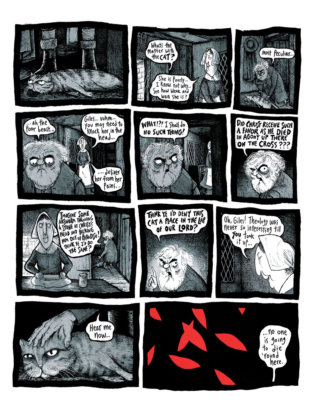 Wickey worked on this book for a decade, and the labor of love comes through. Centered in Salem, the heart of the story lies with Giles Corey, who famously demanded “more weight” as he was pressed to death during the Salem Witch Trials. We don’t get a rosy picture of Corey, who was neither good nor kind; he is altogether human and flawed, as are most of the people in Salem, from the men making decisions on murdering women to the young girls who feigned being under attack, sending women to their deaths. With this event serving as the story’s nucleus, Wickey builds the history of Salem and the American ability to turn the most gruesome of events into pop culture phenomena. We meet the ghosts of Nathaniel Hawthorne and Henry Wadsworth Longfellow, who hold thoughtful conversations as they stroll Salem’s streets, and we see modern-day Salem as a hub for witchcraft aficionados and Hocus Pocus fans: but do they understand, truly understand, what happened there? Wickey’s thoughtful dialogue may make readers take another look at the merchandising of the Salem Witch Trials and come away with a more sobering outlook. Illustrations go between a woodcut look for Corey’s tale and more realistic artwork for Hawthorn, Longfellow, and modern-day Salem, infusing Colonial Salem with a historical look and feel that makes readers feel like they’re reading long-lost library tomes. Meticulously researched and flawlessly presented, this is a brilliant work of historical fact and fiction that deserves a place on shelves in teen and adult graphic novel collections.