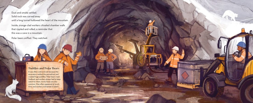 Located deep in a Norwegian mountain is the key to protecting the planet’s resources: the Svalbard Seed Vault. Just in Case tells the story of the Svalbard vault using clear and easy-to-understand language; Clendenan infuses her straightforward narrative with beautiful language, pairing with Cicchese’s digital landscapes to inspire awe: “Steel doors open and beckon into the belly of a mountain. Inside the air is as cold as the Arctic outside. Walls of ice shine like stars”. Clendenan and Cicchese show people from all over the world coming together to farm, plant, and eat together, thus creating a respect for nature and what the planet provides. Callouts throughout the book provide further context the importance of seeds and the vault’s creation. Frequent use of the phrase, “Just in case”, resonates with readers of all ages who hear – and say – the same phrase for everything from bringing an umbrella on a cloudy day to carrying a purse-sized first aid kit. It’s a phrase that speaks of importance, the need to be prepared, and creates a bridge of understanding. Back matter includes information on the need for seed safety, an author’s note, a bibliography and further resources. If you haven’t purchased this for your shelves yet, please do it now.