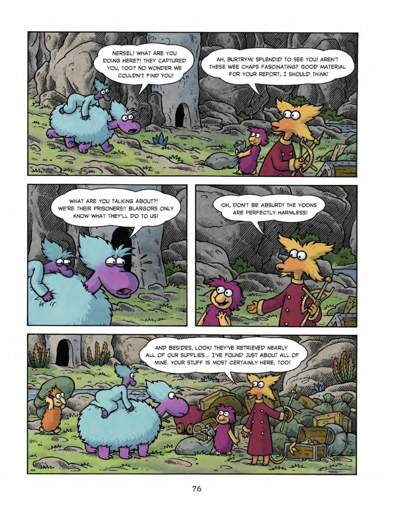 Much like Star Trek’s Starship Enterprise, the crew of the H.M.S. Gwaniimander is on a mission to explore the outlands of Crutonia. Led by Captain Quenterindy Quirk, a captain whose overconfidence far outpaces his competence, the crew finds their voyage cut short by disaster when giants attack the ship and try to eat the crew! The survivors make their way to land, and Quirk – when not bemoaning his terrible luck – tries to keep his crew to their royal mission. After all, what better land to map than completely unknown territory? There’s danger all around, but Quirk’s crew seems to be more on the ball than he is.