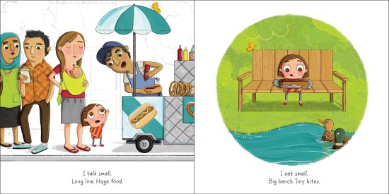 Sometimes it’s a drag being small. It can be intimidating. In Small, a little girl goes through a day in the crowded city feeling small and overwhelmed. When ducks snatch her hot dog, she feels helpless… until a trip to a playground helps her turn it around by allowing her to embraces the positives in her life and how they make her feel big. The love of her family; her drawing ability; her fierce game – all of these and more make her big, brave, and loved.