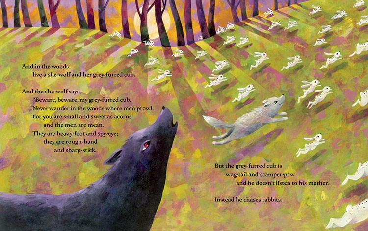 Told like a modern-day fable, Just Like Brothers teaches readers about the problems formed by prejudice and baseless judgement; it also teaches the value of empathy and trust. The innocence of children, both here and in real life, has no place for prejudice; it’s passed on at an early age. It’s a call to us as caregivers to be careful not to let our own fears make us irrational in what we teach our kids. It’s the start of a conversation, with lyrical descriptions like, “rough-hand and sharp stick” to describe humans, and “wag-tail and scamper-paw” to describe the playful cub. This makes for a good read-aloud and discussion about friendship and trust.