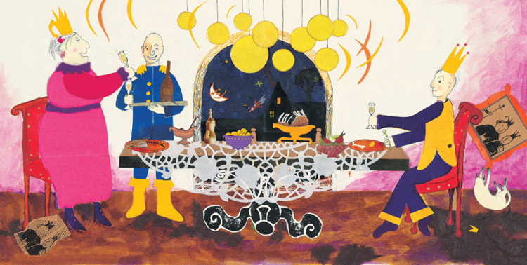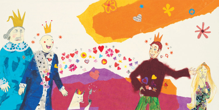 King & King is a celebration of love, versed as a fairy tale to make it extra child-friendly to 2003 audiences, but it still holds up today. The mixed media artwork is colorful, even a touch chaotic, giving readers plenty of little details to wander the pages for: Crown Kitty is always up to something; rocket, hot air balloons, and planes fly through the sky; an explosion of hearts herald the meeting of the princes. The character drawings look almost childlike, increasing the appeal to kids. The couple’s adventures continue in 2004’s King & King & Family.