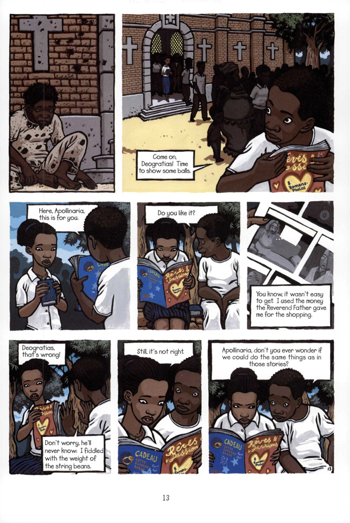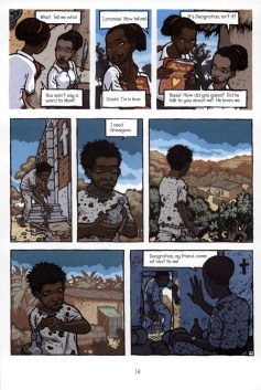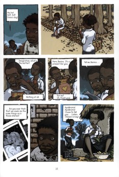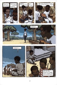 Originally published in the States 2000, Deogratias is a brutal retelling of the Rwandan genocide. Deogratias is a young Hutu teen whose story is told in flashbacks. In love with Tutsi half-sisters, Apollinaria and Benina, he finds himself caught in the middle of a violent conflict when tensions between the two groups explodes. When he plays a part in Benina’s death, he begins spiraling into alcoholism and insanity. Deogratias is a hard read. There are panels depicting poverty, prostitution, and violence. The author doesn’t shy away from coarse language, or the core subject matter of the book: genocide. It’s painful to watch Deogratias’ decline, but Deogratias remains a solid choice for putting a human face on the Rwandan genocide. This one is for mature teens and up. Deogratias has starred reviews from Kirkus and Publishers Weekly and has received multiple awards, including the Goscinny Prize for outstanding graphic novel script (2000), and designations as one of the American Library Association Best Books for Young Adults, YALSA Great Graphic Novels for Teens, YALSA Great Graphic Novel for Teens, and ALA Best Books for Young Adults.
