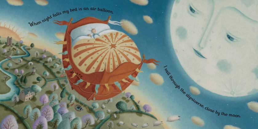 My Bed is an Air Balloon brings playfulness and joy to bedtime storytime. Alison Jay’s whimsical art creates a fantasy landscape where smiling suns and moons overlook a sea of white, cloudlike dream-shapes; giant beds that become balloons and ships, and boats that look suspiciously like bedtime slippers. There is a wonderfully retro feel to the artwork; a 1920s-type look and feel with round faces, expressive eyes, and long, thin noses with a slight, secret smile.