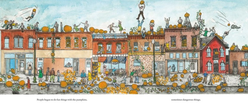 Readers will get a kick out of this “nature gone wild” story, which pairs nicely with Cloudy With a Chance of Meatballs. It’s a short, simple story with a touch of fantasy and humor that will get kids giggling. The artwork bustles across each spread to give the feel of a busy town trying to accommodate all of these pumpkins!