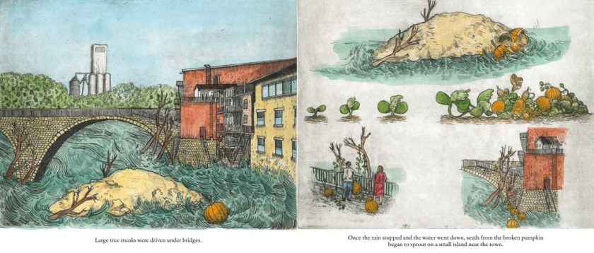 This “what if?” story is inspired by the real-life town of Elkader, Iowa. In Pumpkin Island, a rising river washes away a pumpkin, which cracks and spills open on a small island near Elkader, releasing its seeds, which immediately begin sprouting vines and growing pumpkins. The pumpkins start showing up all over town, prompting the residents to do all sorts of things, from creating delicious recipes to constructing catapults (ever hear of Punkin Chuckin?). But the vines keep growing, and the pumpkins are everywhere. When Halloween arrives, the pumpkins get one last glorious moment, before the townfolk cut the vines and mulch the pumpkins, but even then, pumpkins take on a life of their own, with beautiful flowers sprouting from the compost.