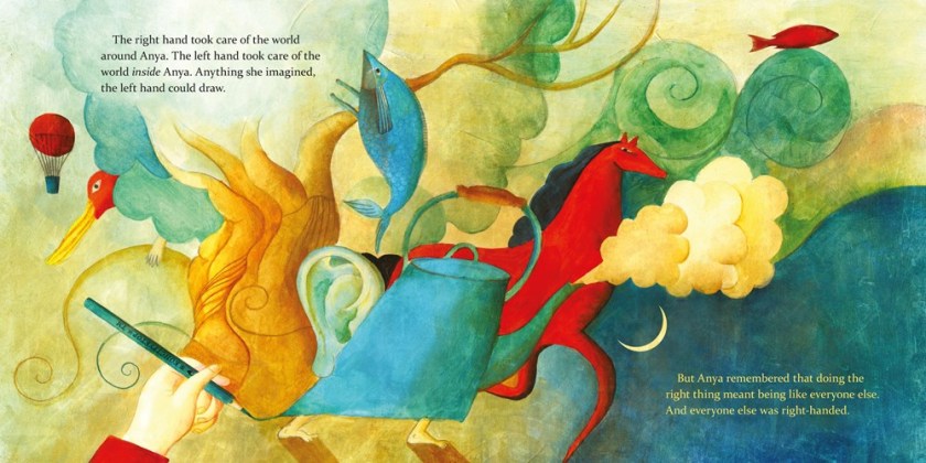 Anya’s Secret Society uses beautiful language to communicate the desire to create art while lamenting the crushing conformity that threatens to squelch it. Anya draws, left-handed, in secret, and the text reveals that “…the right hand could not draw. Only the left hand could draw”, and “The right hand took care of the world outside Anya. The left hand took care of the world inside Anya”.