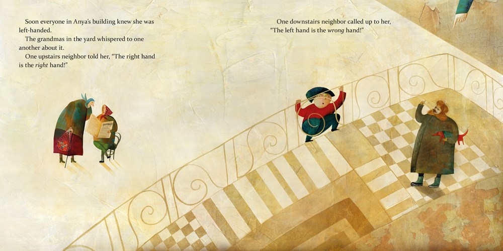 Anya is a young Russian girl who favors her left hand from an early age. She loves to create; she draws and paints, but she’s under constant scrutiny over her left-handedness. Even her neighbors correct her, saying things like, “The right hand is the right hand!” Under social and school pressure, Anya begins using her right hand to write, but she just can’t create with that hand. Her creativity, her art, flows from her left hand. Anya discovers a secret world of left-handed creators, including Leonardo DaVinci and Michaelangelo; she imagines herself part of their secret society, wearing masks to hide their identities as they flout conformity and use that sinister hand. When Anya’s family moves to America, though, she discovers that there is no stigma about which hand to use. She uses her left hand in public, and no one even notices! Her teacher doesn’t correct her! Anya is, at last, free to create.