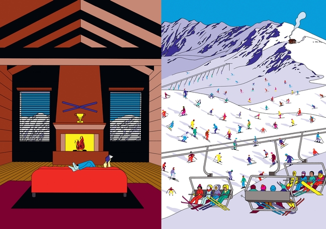 Playing with perspective and scale, Inside Outside is a wordless book that uses 18 spreads to encourage readers to look at things differently. A spelunker descends into a cave filled with crystals on one page; on the other, his fellow explorers wait outside the hole, helping to lower him down. It’s an unassuming scene until you take both views into consideration. On another spread, a canopy bed sits alone in the dark; a pillow lies on the floor, and the canopy is torn; the torn fabric tied to a post and leading out a window. On the facing spread, we see a a castle among a wide vista, knight standing guard at a turret… and a slit of a window, with a knotted fabric rope traveling down the wall. Look closer, and you’ll see a figure wading to shore, her long blonde hair down her back. Some of the illustrations are tongue-in-cheek, like the page that has a darkened museum gallery with a broken velvet rope and a missing picture; its facing page has a burglar, dressed in black, carrying a flashlight and a white frame across city rooftops; others invite more thought, like a rapidly beating heart that reveals itself to belong to a bungee jumper on the facing spread.