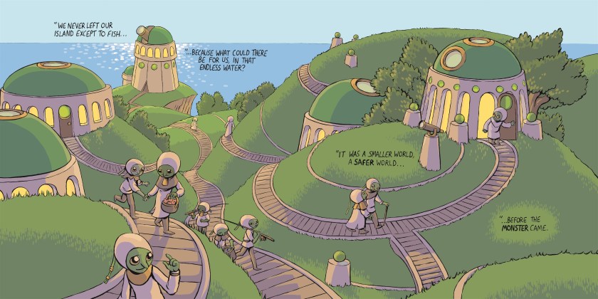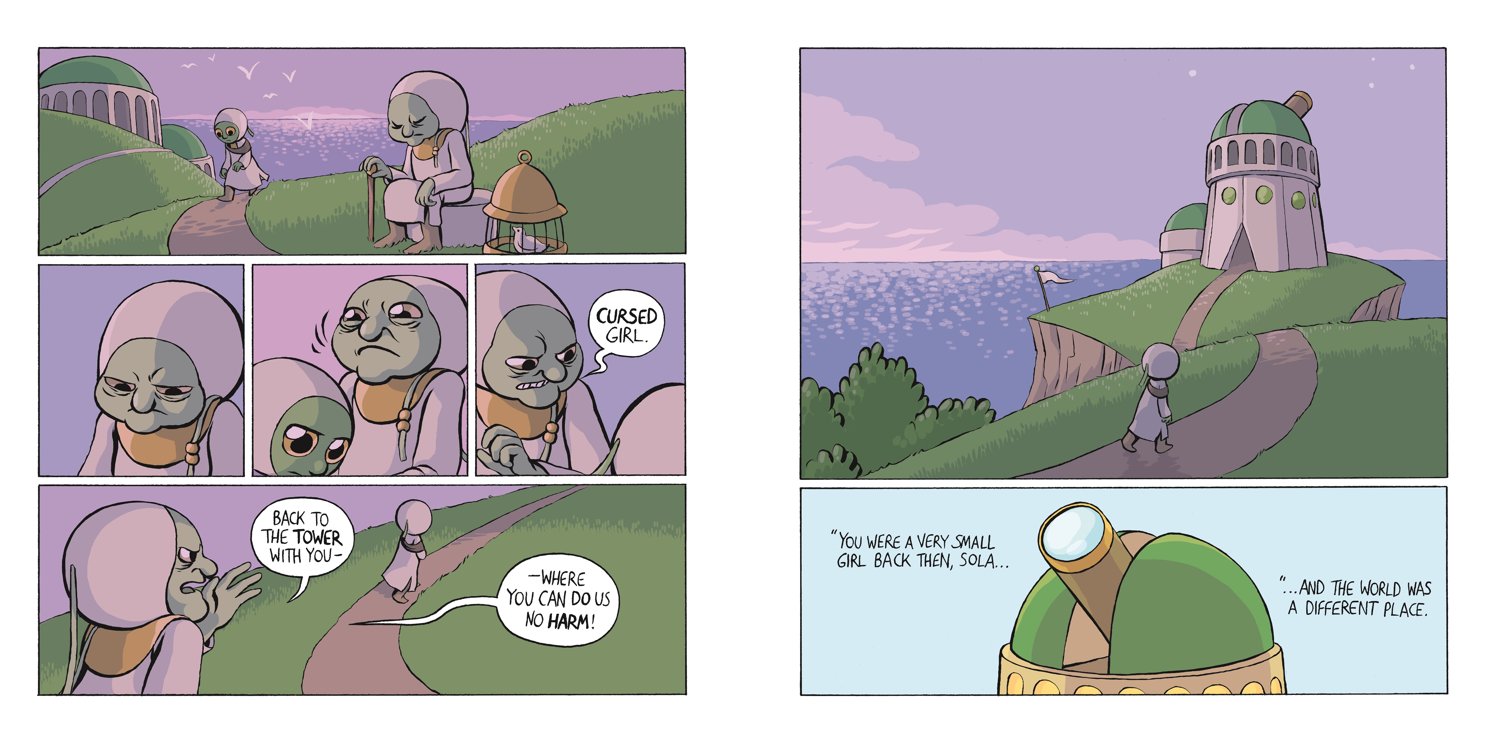 Sola lives as an outcast within her small community on an island. She is cursed – that’s what everyone says – because a Monster came to the Island when Sola was a child; everyone around her ran, but Sola alone stood before it, and it reached out to her. The destruction left in the monster’s wake, coupled with its interest in Sola sealed it: the rest of the Island branded her. As Sola reaches adolescence, she’s curious: what drew the Monster to her? Tired of living with everyone’s fear, and wanting answers, Sola leaves the island, taking to the open water. As she travels, she discovers that the Island isn’t alone: there are new lands and people to meet.
