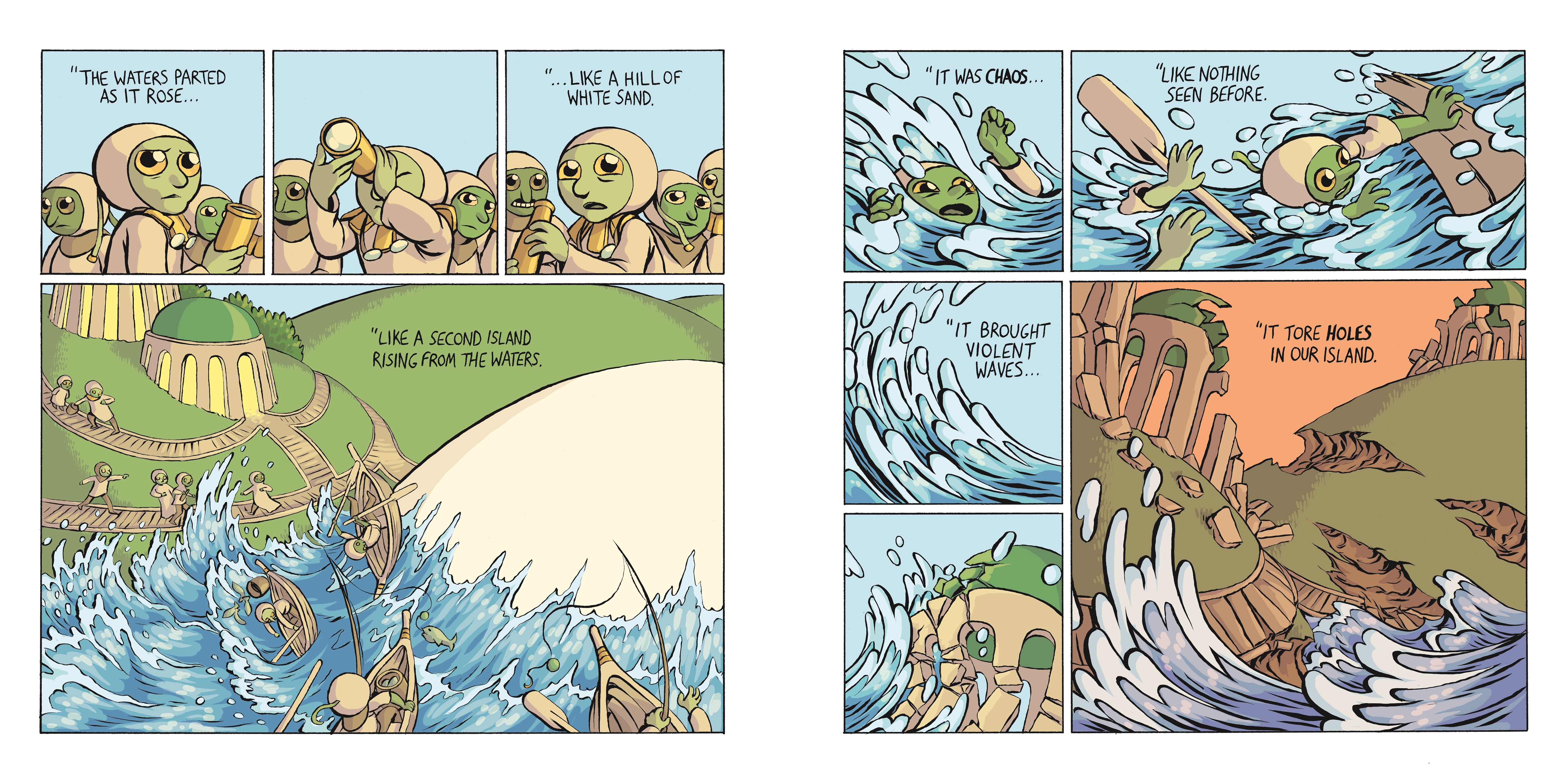 Island Book is Sola’s story. A quietly strong female protagonist, she faces adversity at home and has a curious streak that contributes to her own community’s distrust and fear of her. The plot meanders on a bit in spots, but is mostly a solid story about courage and curiosity; about friendship and working together, and about opening oneself up to new ideas and experiences. The characters are humanoid but not human; the artwork is bright and the nature is beautifully depicted.