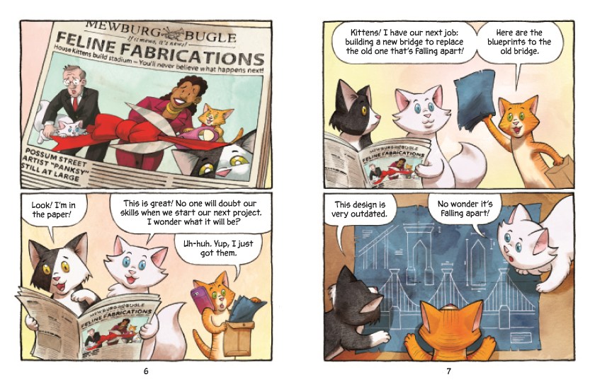 John Patrick Green creates stories that make me happy. Hippopotamister is all about a hippo finding his purpose; the first Kitten Construction Company story was about being taken seriously; and now, A Bridge Too Fur is about overcoming fears and biases, and embracing teamwork to make one’s corner of the world a better place. He tells big stories in a small space, with adorable artwork and situations that appeal to young readers while teaching them how to be a positive force in the world. That is good stuff, and that is the kind of book that flies off my shelves here at the library. Kids come for the cute animals, stay for the positive messages. There’s some fun humor on the down-low that sharp-eyed readers will catch, like references to a possum street artist named “Panksy”, and Marmalade knocking a mic off the podium when he goes to speak (because, that’s what cats do). A “How to Draw Kittens” section teaches readers to draw some of the characters in the story.