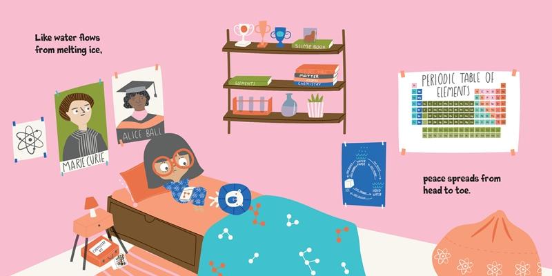 Twelve kids who dream of being scientists get ready for bed in this adorable, rhyming bedtime STEM story. Each spread features a different child who favors a different area of science, and the spreads are a feast for the eyes. The verse maps to each child’s preferred area, bringing art and verse together to give kids a mini-science lesson on each spread: each child has favored scientists in each field; bedding and room decor cleverly gives readers a guessing game of scientific proportions. A little girl looks out her window at the moon, shining through her planetary curtains; on her bedside table is a book on stars and planets, and she has posters of Carl Sagan and a Space Shuttle hanging up. The verse reads, “The sun has tucked itself in bed; the moon is on the rise”; on the next spread, a boy lays across his map of the world rug, reading; his bedding depicts a mountain scene, and he has a shade with an erupting volcano drawn. A poster of geologist Jess Phoenix hangs on the wall, and the verse reads, “Under rumpled mountain quilts, the earth is snuggled tight”.