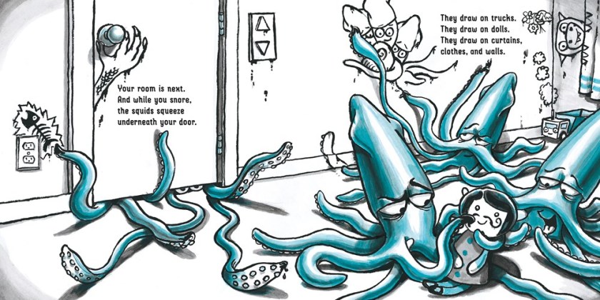 Theodor Seuss Geisel Honor-winning author and illustrator Jonathan Fenske creates a funny rhyming story about a group of squids indulging their inner artists. When the clock strikes midnight, a squad of squids is feeling like a change of scenery, so they head over to someone’s house – is it yours? – to exercise their creativity. They draw all over the kitchen and the halls, inking sharks in your bathroom and drawing all over the toys they find in the way. They even draw on YOU: good thing you’re a solid sleeper! But the sun comes up, and the squad goes back to the ocean, leaving you to answer for the mess. After all, are they really going to believe you if you tell them it was a Squid Squad? Maybe, just maybe, though, you’ll leave one little memento, one little bit of artwork, just to enjoy for yourself…