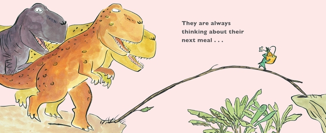 Some dinosaurs are small. Some dinosaurs are big! A small dinosaurs wanders through the jungle with a little shopping basket, gathering food to munch on. Three bigger dinosaurs start following our little friend, looking for their next meal. Those bullies are in for a big surprise, though… An adorable story with factual text for beginners – “Some dinosaurs are small. / They have tiny flat teeth for munching through fruit and leaves. / Some dinosaurs are big. / They have huge pointy teeth and sharp claws” – the story takes a very satisfying turn that will leave readers giggling and cheering. The watercolor and ink artwork tells a playful story, while the text gives readers the facts; together, they create a fun story that will delight dino fans.