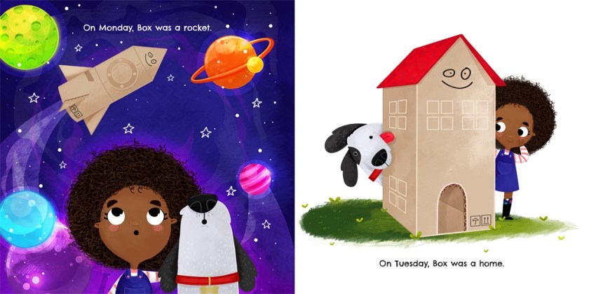 A little girl’s family gets a refrigerator box, and she gets a new best friend. Grace gets Box, and proceeds to have all sorts of wonderful adventures: Box is a home, a rocket, a tent, even ruins in Rome! There seems to be no end to the fun Grace and Box will have together, but one day… Box looks a little under the weather. He’s a little saggy; one of his walls has a rip. Grace decides that he needs a break, and takes care of him, bandaging him, letting him rest, even feeding him soup, but he’s still droopy. What’s a kid to do? Reinforce Box and play on! Grace and Box is a story about invention, inspiration, and the joy of creation. Bright digital artwork is appealing and expressive. Grace and her dog have loads of crafting material to share with Box, who has a sweet, drawn-on face that always has a smile for Grace. Rather than ditch Box when he gets a little worn down, Grace patches him up and keeps playing with him; a nice divergence from disposable culture. As a mom who’s had a cardboard fort in my living room since Christmas, I can appreciate Grace and Box’s relationship. Rhyming text is easy to read and colorful artwork pops off the bright white pages. Pair with Antoinette Portis’s Not a Box and Not a Stick.