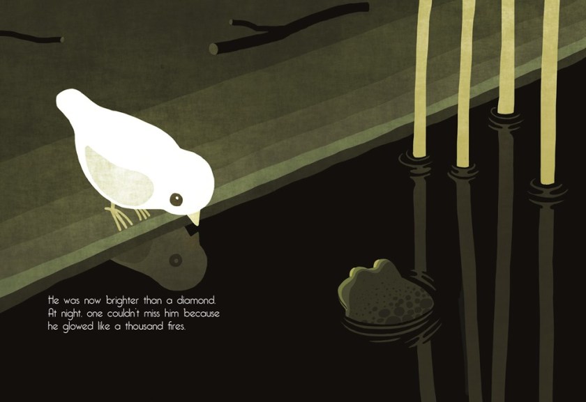 One night, a bird swallows a star, making brighter than a diamond. But because he “glowed like a thousand fires”, none of the other animals want him around them; he makes them vulnerable to predators. Alone and sad, the bird cries glittering tears that sprout into golden flowers, and a wandering traveler discovers him. Enchanted by the bird, the traveler takes him on as a companion. A beautifully illustrated story of how friendship sees into everyone’s inner light, The Bird Who Swallowed a Star is a story of imagination and inner strength. The textured cover glows in the dark and will delight younger readers. The illustrations play beautifully with light and shadow with elegance. The storytelling is repetitive, encouraging readers’ confidence as the story continues. The ending allows for imagination: encourage littles to interpret the wordless final spreads to finish their story. A solid choice for social-emotional collections. Originally published in French in 2015, it’s wonderful to welcome The Bird Who Swallowed a Star to U.S. bookshelves. Visit illustrator Toni DeMuro’s webpage for more of his illustration work.