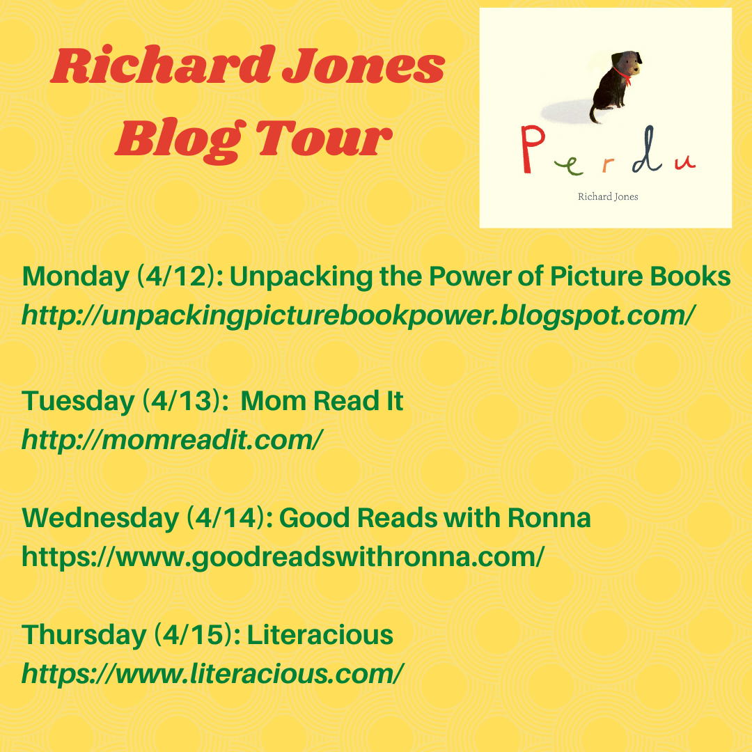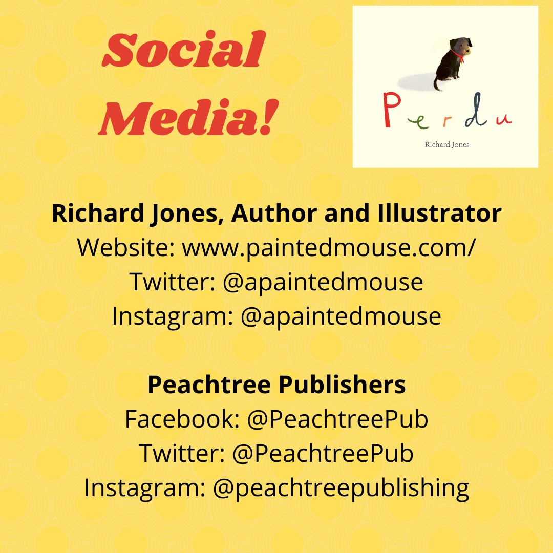 Back in February, I wrote about Richard Jones’s latest book, Perdu – his first as an author and illustrator! This book about a little dog who really needs a friend melted my heart, so I’m happy to talk about it again for the book’s blog tour. Peachtree Publishers was wonderful and secured me an interview with author Richard Jones, too!