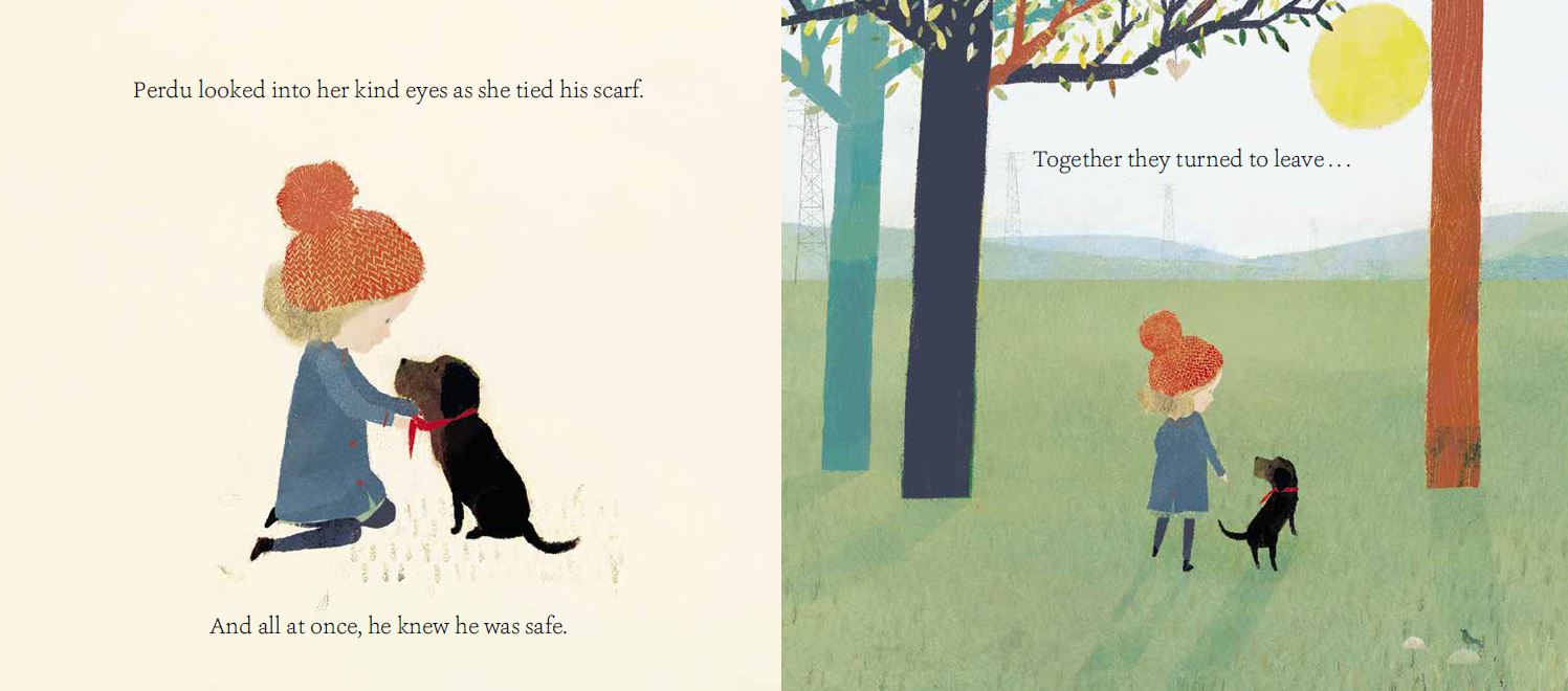Richard Jones: Perdu is a dog with a mysterious past and I wanted him to carry a little piece of it with him as he searches for a place to call home. His scarf is his only possession, so when he loses it after a mix up in a café, he feels entirely lost. When the little girl kindly ties it back on, she’s not only returning to him his possession but also giving him back his self-worth and confidence.