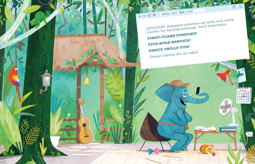 Tabitha is a pampered kitty who longs for the wilder side of life. Fritz is an elephant who dreams of celebrating his birthday with a fabulous voyage to a new place. The two meet via the website Lair-BNB, and agree to swap places. As the often hilarious exchanges reveal, the grass isn’t always greener on the other side, as the two discover that while adventure can be fun, there really is no place like home. At first, Fritz loves splashing in the swimming pool with Tabitha’s human, Claudia; Tabitha loves that the great outdoors can be her personal litter box! But as the vacations stretch on, Fritz finds himself in trouble for taking dust baths on Claudia’s family lawn and mistaking a donut sculpture for a tasty snack; Tabitha is not a fan of the dust bath or the lovely waterfall that Fritz enjoys so much. The two quickly agree to return to their own lives, happier for the journey but glad to be home.