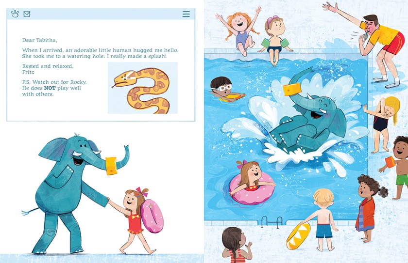 Kids will love the lively digital illustrations, colorful and with comically expressive characters. They’ll love the e-mail narrative between Tabitha and Fritz, allowing for a fun readaloud where you can switch up voices and put your own spin on their observations while showing off the pictures. The endpapers bookend the story, showing Fritz and Tabitha, both showing their need to get away from it all, on the front endpapers; snapshots from the two, surrounded by their friends (and maybe a guest or two), back home. It’s a great vacation story and a great way to give context to that feeling that adventures are great… but there’s no shame in wanting to go back home when you’re ready!