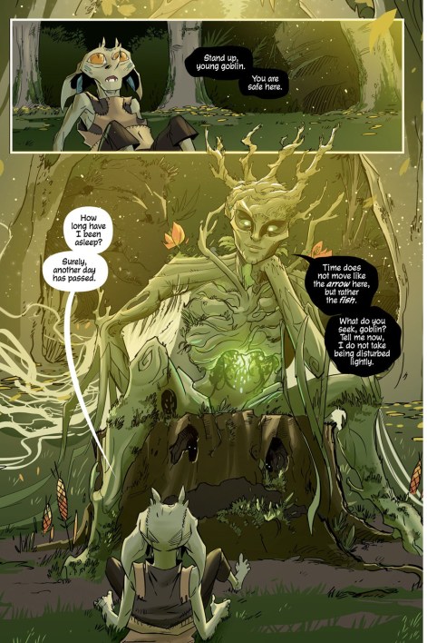 Goblin is a gorgeously illustrated fantasy graphic novel. The colors are as incredible as they are horrible at points: the insidious curling of the smoke around Rikt when he awakens; the firelight as his home burns; the colors dance across the page, looking almost real. Will Perkins brings Rikt’s grief and terror to the page, using color and shadow, to hit readers in the feelings. The majesty of the Goddess as she appears to Rikt is one of the best panels I’ve read so far this year.