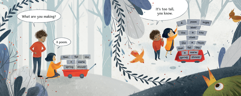 This colorful exploration of the moving nature of poetry is so much fun. A girl constructs a tower of words, creating a poem, which flies away, going on a series of adventures where the words will reassemble in the water, on a clothesline, and carried off by dogs, birds, and buses, with new experiences to read about each time. Three children chase the words, calling, “Stop that poem!”, but that’s the thing, about poems: words are free and flow like water, like air currents. It’s inspiring for younger readers, learning to put their thoughts together, and the colorful artwork and movement furthers the idea that words never stay in one place. The words of each poem appear on cards, allowing for fun programs where kids can assemble their own poems, either from words they write, or words you provide for them. I used to have large MegaBlocks with sight words glued to them that let kids create their own words during play, at my library; this could be a fun learning exercise for preschoolers! Stop That Poem! is a fun addition to your wordplay books.
