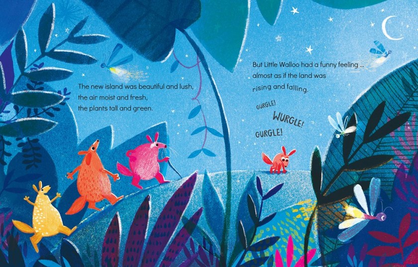 The Walloos are kangaroo-like animals that live on a small, rocky island where Little Walloo dreams of having an adventure. The family travels to a tropical island, where they begin using the island’s plants for food and building, but something doesn’t feel right. The island is making funny sounds and… moving! When the Walloos realize that their island is actually a big hippo, they’re delighted, until they realize that they’ve made life rough on the hippo, by stripping away all the plants that used to keep Hippo cool and shaded. If Hippo can’t get relief from the hot sun, he’s going to have to go underwater, and that will be disastrous for the Walloos! The family quickly gets to work on making positive changes to help undo some of the damage they’ve done. A sweet story about adventure, with a great message about being sensitive to the environment, The Walloos’ Big Adventure is adorable storytelling. Mixed media illustrations are colorful; kids will love the cute Walloo family and the lush settings. Hippo has a kind face and is huge in scale to the Walloos, giving kids a nice side lesson in scale.