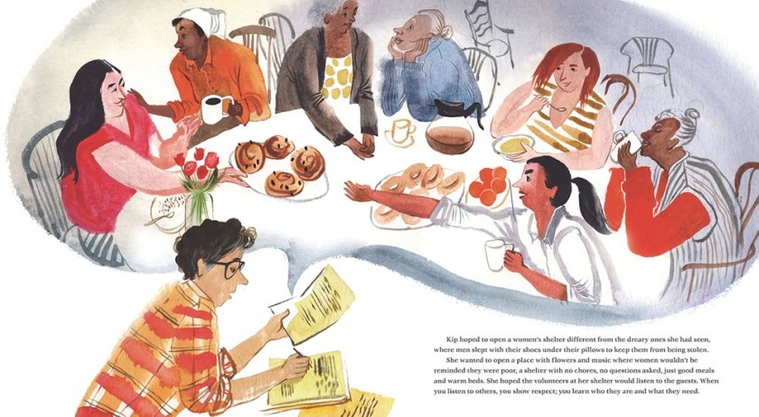 Inspired by her grandmother, who fed hungry men from her door during the Great Depression, Kip Tiernan went on to work with and feed the homeless as an adult. She noticed women dressing as men to get on the food lines, and began noticing more and more homeless women on the street; when she worked to bring public notice and aid, however, she was initially told that homelessness was not a “women’s problem”. Determined to make a safe place for women, she pushed until the city of Boston rented her an empty supermarket for $1 a year: Rosen’s Market because Rosie’s Place, opening in 1974; they served hot meals and provided free clothes, beds, and a safe place for women to come together. Sanctuary is Kip Tiernan’s story, told in straighforward prose and accompanied by evocative watercolor and digital illustration set against a white page, giving readers the feel of peeking into moments from Kip Tiernan’s life. The focus is on community, with multicultural women coming together to talk and support one another; there are embraces, hand-holding, and active listening, all there to emphasize the importance of connection and compassion. Display and booktalk with Dangerous Jane, the picture book biography of Jane Addams, founder of Chicago’s Hull House.