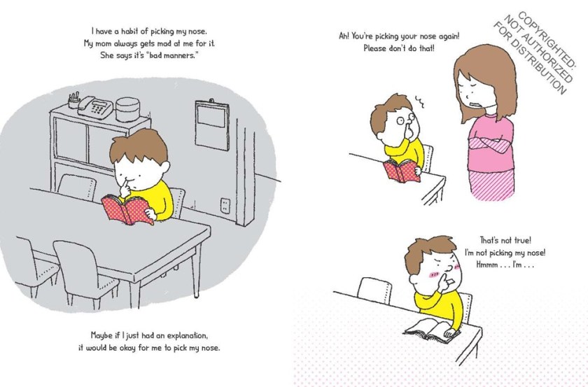 A young boy explains his bad habits in the most hilarious of ways in I Can Explain. His mom may think it’s bad manners, but when the boy picks his nose? It’s actually him pressing a button to release cheerful beams. And biting his nails? It releases a sound that makes crows fly away from the trash bags; adults just can’t hear it. For every behavior, there’s a completely valid reason: he can explain! An absolutely uproarious read-aloud that ends with Mom having to find an explanation of her own, too, I Can Explain is a conversation starter about manners that acknowledges a child’s imagination and doesn’t take itself so seriously. Pen and digital artwork create an unfussy story with bright pinks and yellows and over line art; other colors come into play for emphasis. Endpapers get into the act, with the front endpapers showing our narrator recreating some of his bad habits, and back endpapers showing readers that Mom isn’t always so blameless, either.