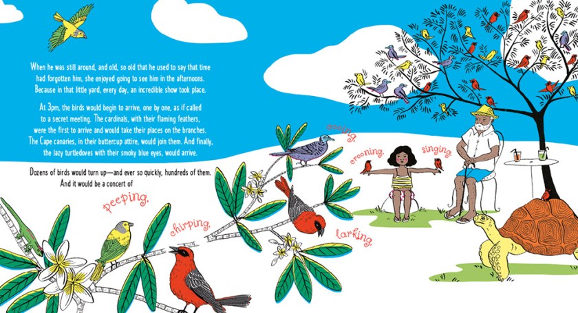 Set on the African island nation of Mauritius, the story centers on Sara, a young girl who loves birds. They remind her of time spent with her grandfather, who had dozens of brightly colored birds flock to his yard every day, to put on “an incredible show” with their colorful feathers and personalities. As Sara is on her way to school, she sees a tiny house in a neighbor’s yard, and realizes that it’s a birdhouse, home to a flock of parakeets. The neighbor chases her away, but Sara is undaunted: she wants her neighbor’s birds to be as free as the birds that entertained her and her grandfather. Lyrical storytelling and bright digital artwork bring this story to life. The skies and water are deep blue, setting the stage for the brightly colored birds to showcase against. Loopy script calls reader’s attention to the names of different types of birds and their songs, from peeping and chirping to crooning and cooing. People and birds are rendered realistically; Sara and her grandfather are brown-skinned and the only human we see; other humans are in shadow or silhouette. Sara’s story is filled with longing: longing for freedom, longing for her grandfather; the artwork shows a loving relationship between the two, and she gazes wistfully at the birds in the cage, remembering him. Edwige-Renée Dro’s translation from the original French reads beautifully in English, and makes A Dream of Birds a good readaloud choice. A nice purchase for collections.