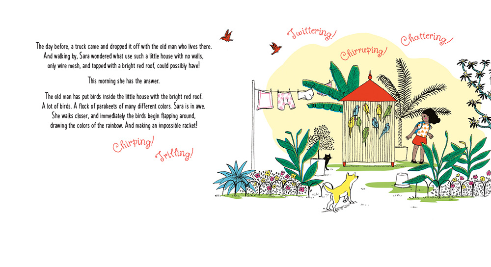 Set on the African island nation of Mauritius, the story centers on Sara, a young girl who loves birds. They remind her of time spent with her grandfather, who had dozens of brightly colored birds flock to his yard every day, to put on “an incredible show” with their colorful feathers and personalities. As Sara is on her way to school, she sees a tiny house in a neighbor’s yard, and realizes that it’s a birdhouse, home to a flock of parakeets. The neighbor chases her away, but Sara is undaunted: she wants her neighbor’s birds to be as free as the birds that entertained her and her grandfather. Lyrical storytelling and bright digital artwork bring this story to life. The skies and water are deep blue, setting the stage for the brightly colored birds to showcase against. Loopy script calls reader’s attention to the names of different types of birds and their songs, from peeping and chirping to crooning and cooing. People and birds are rendered realistically; Sara and her grandfather are brown-skinned and the only human we see; other humans are in shadow or silhouette. Sara’s story is filled with longing: longing for freedom, longing for her grandfather; the artwork shows a loving relationship between the two, and she gazes wistfully at the birds in the cage, remembering him. Edwige-Renée Dro’s translation from the original French reads beautifully in English, and makes A Dream of Birds a good readaloud choice. A nice purchase for collections.