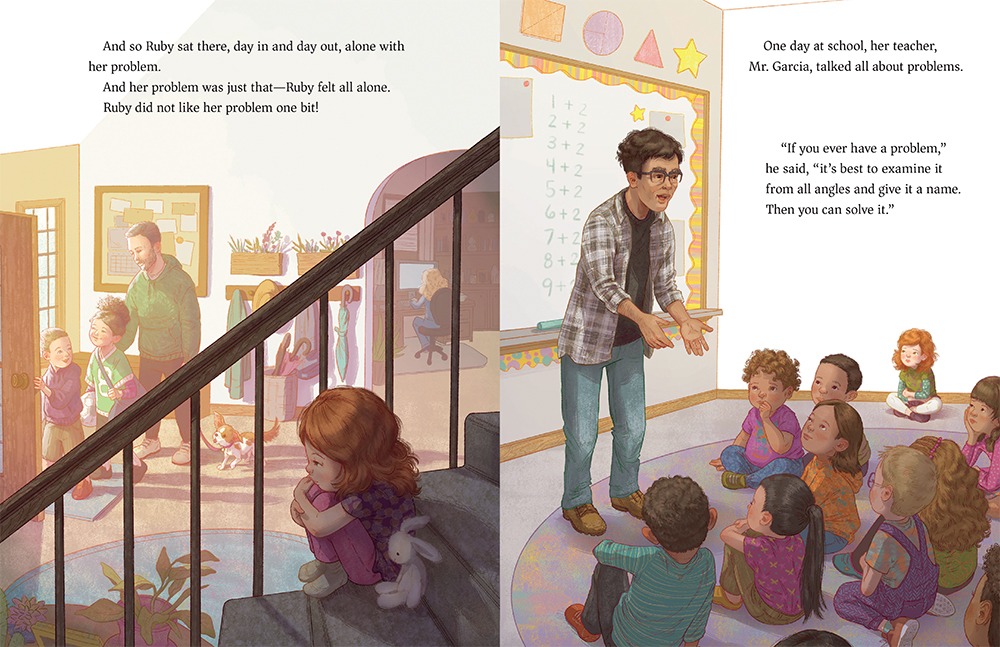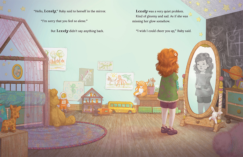 Ruby is a young girl who feels lonely. Overlooked. The other kids at school don’t seem to notice her as they play together. Her siblings are always busy with their friends, and her parents are busy either working or zoning out in front of the TV. She doesn’t have the words to express herself, so she withdraws further, disappearing into her loneliness, until a teacher suggests that “examin[ing] it from all angles and giv[ing] it a name” will help solve things. Ruby decides to name her problem Lonely, visualized first as a black and white reflection of Ruby in the mirror. Ruby decides to befriend Lonely, spend time alongside Lonely, and the two begin spending time together. Comfortable with her solitude, Ruby gains more confidence, drawing the attention of other kids and finally giving Ruby the ability to ask for what she needs, including time with her family. As Ruby gains more confidence, Lonely takes on color and steps out of the mirror, an inner light shining through her. But Lonely also knows when it’s time to hand Ruby the reins, and quietly returns to the background, still colorful, quietly cheering on Ruby and “waiting deep inside, whenever Ruby needed her”. A gentle story about loneliness and learning that confidence comes first from spending time with oneself, Harren uses color and realistic illustration to deliver Karst’s message. Ruby’s red hair shines once she and Lonely embrace one another; her clothes go from muted darker colors to bright yellows, blues, and pinks; her face turning up and smiling, moving from a head-down, preoccupied frown. An author’s note and questions for discussion round out the back matter. A good book to have on hand for social-emotional collections.