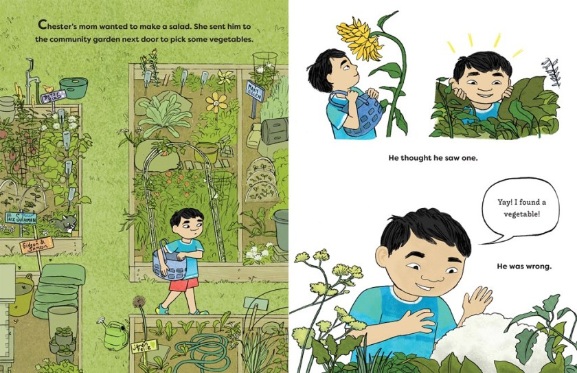 Chester is a kid who just wants to get some vegetables from the community garden so his mom can make him a salad. He gets schooled by the garden’s inhabitants on the many groups that fall under the “vegetable umbrella”. Broccoli? That’s a flower, and her name is Juanita, thank you very much. Potato and Carrot? Those are roots; Lettuce and Kale? Those are leaves. Cucumber, Pepper, and Eggplant are all fruits. Different groups explain their importance and their jobs to Chester with often hilarious moments: Lettuce informs Chester that being good in a salad doesn’t make one a vegetable: “…bacon is good in salads, but that doesn’t make bacon a vegetable”. When Chester claims that vegetables taste good but don’t have a lot of sugar, Beet corrects him, noting that “they literally use me to make sugar”. So why are all these different groups of tasty foods grouped under one term? “Say anything enough times and it’ll stop sounding like a real word”, replies Corn. Newbery Honor Award and Stonewall Award winner Lukoff takes a funny story about vegetables to teach a lesson on social constructs, and an author’s note at the end of the story invites readers to think about and discuss other social constructs. Tsurumi’s illustrated vegetables have personality, and Chester is sweetly exasperated as he tries to work it all out. Endpapers show the group of of sassy “vegetables”, clearly labeled to help readers identify them. Download free activity worksheets here.