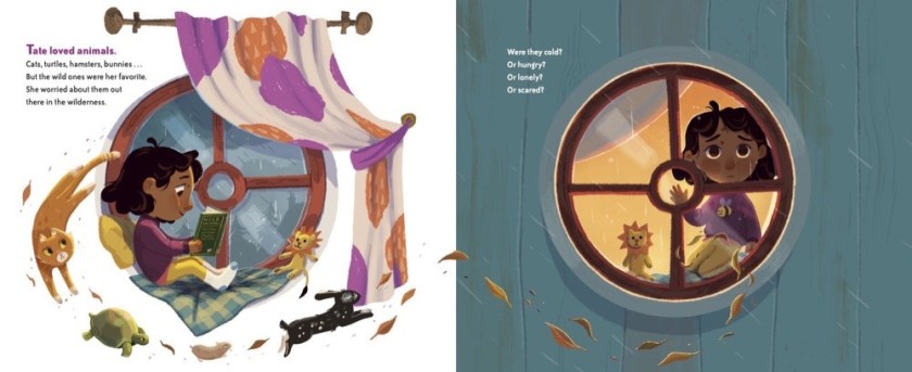 Tate is a young girl who loves animals, but she worries about the animals who live in the wild. Are they cold and lonely? She can help! She sends letters to several animals with offers of a warm bed, spa treatment, meals fit for a king, even a trampoline, but each animal politely declines her offer. They’re all happy where they are – or are they? There’s one potential best friend out there that Tate misses at first. Animal lovers all over will immediately relate to Tate and her desire to care for the lions, tigers, bears, and other wild animals in the world, only to realize that all she has to do is look a little bit closer to home. Fun animal facts pop up in each animal’s letter to Tate, and Burton’s colorful, cheery illustrations are a delight to see. Sharp-eyed readers will see Tate’s new friend appearing in each spread, and will likely be waiting on pins and needles for Tate to take notice. An appealing treatise on wild animals needing to stay wild while empowering kids to help make positive changes, Tate’s Wild Rescue is a great adoption story and a tale of finding home.