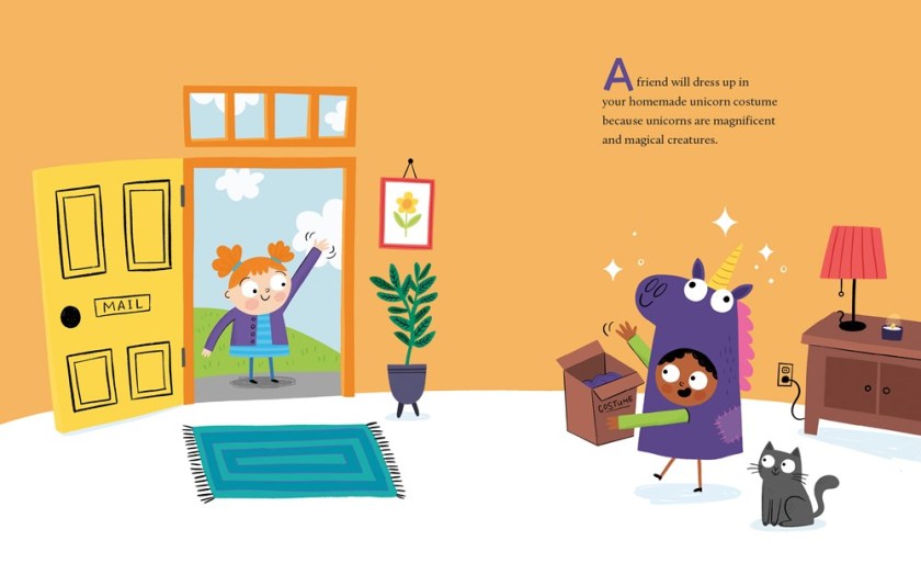 What makes a best friend – and what happens when that friendship is in trouble – forms the foundation of this relatable and charming story. Being a best friend means a lot of things: dressing up as a unicorn together (even when one person has to be the decidedly non-magical back of the unicorn); playing knight and dragon; even naming your favorite goldfish after your friend. Two friends illustrate these magical moments until one “accidentally-on-purpose” blows out the candles on her friend’s birthday cake before the birthday girl can make her wish, leading to a terrible split that can only be repaired with an apology. Skeers describes friendship in wonderful ways that kids will immediately understand, with phrases like, “Friendship feels like being hugged by a blanket right out of the dryer”. Fox’s digital illustrations are bright; characters are a white-skinned girl with curly red hair and a brown-skinned girl with top-knot bun, and they play joyfully together until the crisis occurs. Then, as Skeers notes, friendship feels like “being hugged by a porcupine while sitting on a cactus”; Fox shows the girls living their lives separately, sadly, until an apology card with three kinds of glitter and a lot of glue reunite the two. Themes of sharing, apologizing, and forgiveness will appeal to kids and adults alike.