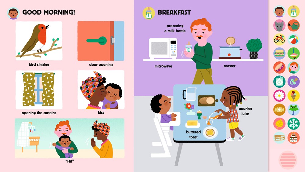 This is such a fun series. My Big Book of Happy Sounds is the companion to My Big Book of Nature Sounds (2023) and My Big Book of Sounds (2019) and includes over 100 sounds organized into areas that invoke happiness: morning sounds like birds singing, morning kisses, and hellos; garden sounds like birds chirping, rolling in the grass, and backyard bowling; together sounds, like laughing, cuddling, and baby babbling. Each button maps to an area of the book, noted by a colorful icon at the top left hand of each page. At the press of a button, little ones can hear all the sounds illustrated on the pages, all clearly labeled. Colorful illustrations show a nonstop parade of fun activities. Perfect for lapsit exploration or to enhance a storytime, these sturdy pages and buttons will hold up to multiple reads.