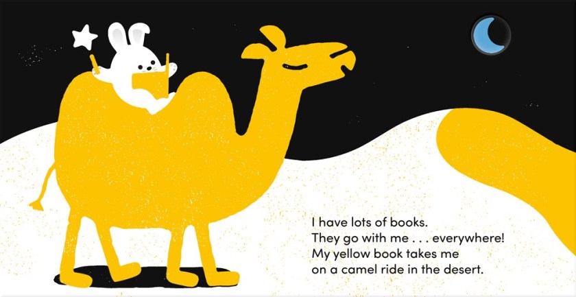 High-contrast artwork with punches of color for extra fun punctuate this fun look at having the right book for the right situation. A little rabbit has lots of books, each with a special mission: the yellow book accompanies the bunny on a camel ride in the desert; a blue book accompanies Bunny on a sailing voyage; a green book ventures into the forest. Die-cuts let readers explore with little fingers; foil overlays emphasize spreads. One-two sentence explanations on each spread place readers and set the stage for deeper text. A great little board book that grows with your little ones, this will be a book they’ll return to again and again, while learning that a good book can accompany you anywhere. A fun introduction to colors and concepts!