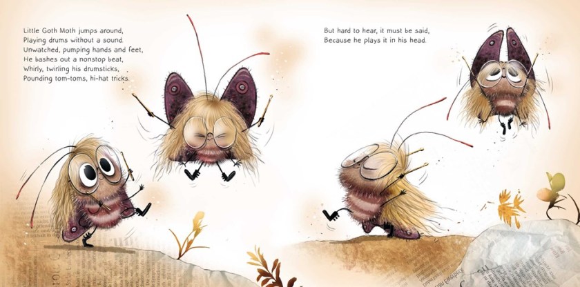 Shy moth Walter keeps to himself in his little attic home, but inside, he’s got the heart of a musician: “Unwatched, pumping hands and feet, / He bashes out a nonstop beat, / Whirly, twirling his drumsticks, / Pounding tom-toms, hi-hat tricks”. He’s a “Goth Moth” and a big fan of Lady B. Marie, aka Jitterbug, but to actually go to one of her shows? Yikes, that’s going out in the daytime! When Goth Moth ultimately ends up at a Jitterbug show, the unthinkable happens: can Goth Moth save the show by taking the stage and playing the drums for real? This sweet story, originally published in Switzerland, has a playful rhyme scheme and takes on overcoming anxiety and fear. The details in the illustration are spot on, with deep browns to give the goth-y look, and a little bit of zing within those browns to wake them up; there are bursts of color around Walter to bring light to the drab. Mohr uses wordplay to create buggy versions of popular albums, including works by Iron Mantis and Def Lepidoptera. Walter sports skulls on his wings; his buddies have very gothy black t-shirts. Goth Moth is an adorable companion to Lüftner and Rauers’s Jitterbug (2023). The duo makes a fun addition to storytime collections – if your readers liked Punk Farm by Jarrett J. Krosoczka, these will be wildly received.
