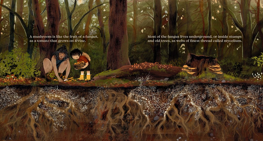 Go on a lyrical exploration with a caregiver and child, discovering the different types of fungi. Baker and Finkeldey engage all five senses in this informational story that walks readers through a forest that “springs a little under your footsteps”; listening to birds and mosquitoes through the canopy; smelling delicious aromoas wafting up from the forest floor; seeing the different colors and shapes of various mushrooms – “like the fruit of a fungus, as a tomato that grows on a vine”, and finally, after a long day of exploring and gathering, tasting “something wonderful indeed”. Earthy-colored illustrations pair with fantasy images of mythical forest creatures to create truly delightful images for the readers. Back matter includes species of mushrooms featured in the story, fungi facts, resources for further reading, and tips for having one’s own mushroom day. A sweet and informative book for beginning mycologists and those with an interest in nature.