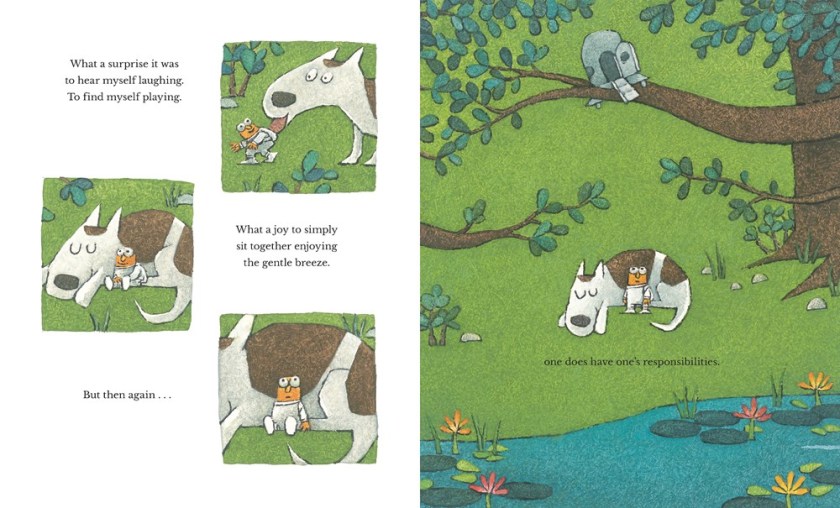 A diminutive spaceman arrives on the latest planet on his roster and sets about his usual, if a bit boring, tasks; collecting, labeling, and filing soil samples. This time is different, though: he discovers a beautiful red flower. While he’s gazing at the flower, his ship is stolen and he pursues the bird in question. While in pursuit, he discovers even more incredible sights: “a fantastical array of creatures… Some were wonderfully strange. Some were adorable. Some were beautiful”. He even meets a curious, furry friend to share time with. After spending a day with his new friend and realizing happiness, he has to make a decision: go back to his responsibilities, or… maybe not? With sweet and deadpan humor, Cecil’s storytelling and illustration makes for a story that readers will enjoy for multiple readings.