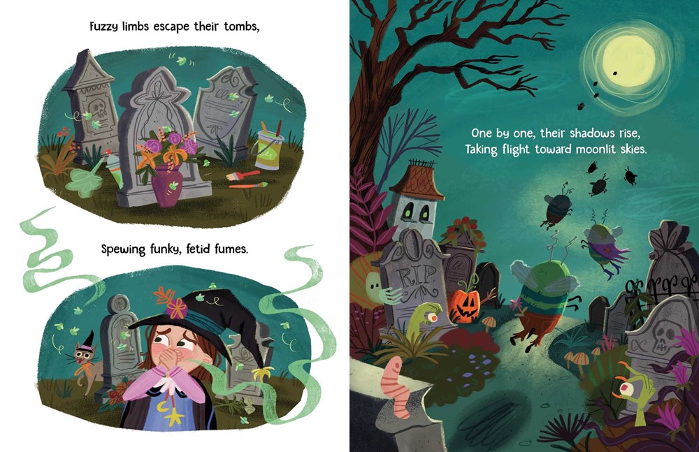 It’s Halloween, and something creepy is buzzing around the graveyard… can it be? Oh no! The ZOMBEES are here! This rhyming tale is sure to be a hit at Halloween read-alouds (or for good, old-fashioned spooky tales storytimes). The Zombees invade a quiet town on Halloween night, but what are they planning? “Are they hunting for a snack? Do they like the taste of veins? Have they come to eat your brains?” Nothing so gruesome: they want to share their special Halloween honey! But are the Zombees all they’re cracked up to be? Keep reading for a fun twist. The buzzing spooks sport colorful capes and goofy, tongue-askew expressions as they do their best midair shamble-flying; they decorate their antennae with eyeballs and spiders. Playful rhyme and adorable digital illustrations set off against bright white or murky green backgrounds set the tone for a Halloween read that kids will demand any time of the year. Download a free educator guide and activity sheets from author Colón’s webpage (and he’s got educator guides and activity sheets for his other books, too!)