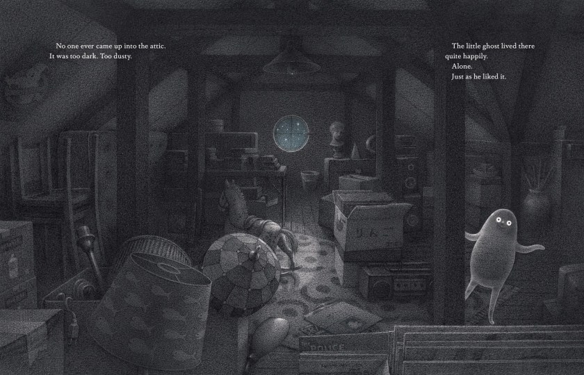 A ghost enjoys the solitude of his attic until a little girl makes her way upstairs and disturbs his peace. What is a solitary ghost to do? Determined to get his attic back, he starts a ruckus, but the girl isn’t scared off: in fact, she seems kind of fascinated. When the ghost decides to visit her room and attempts to scare her on her own turf, she disarms the specter with an offer of friendship. The ghost accepts the offer and learns that “it is good to leave his attic once in a while”, saving his nights for his alone and time and spending his days getting to know his new friend. The primary use of gray and muted colors gives the story a dreamlike quality, and the ghost moves between translucence and a soft white, giving him an almost ethereal quality; his body language is humorous as he tries to hide from his inquisitive new neighbor, changing size, shape, and opacity to inhabit paper bags, shrink to hide behind a stack of books, or become see-through to cause a ruckus. The girl’s colorful outfits make her stand out against the murkiness of the attic, bringing life and color to the little ghost’s world. A sweet story about friendship in unlikely places, this is a fun storytime selection. The Grumpy Ghost Upstairs was originally published in Japan in 2020.