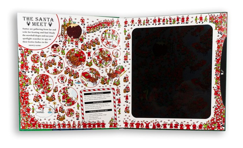 The holiday season brings a new Waldo adventure. The Spotlight books are fun because they add a little more detective work into the mix; dark plastic “winter scenes” on each spread call for a special Spotlight Searcher to slip in and shed a white background against the searching area. There are 6 scenes (including the one on the opening spread) to search, and every challenge calls for readers to search the crowds for Santa, Waldo and friends, and a changing list of objects, from a hatless Santa Claus to solving a jumble by finding letters on building blocks. Visit a Santa Meet and Santa’s Workshop; go Christmas Shopping; enjoy some Festive Baking; join a Jolly Jamboree, and get ready for Christmas Eve. A great learner-directed book to have in a Waldo Corner in your children’s room, and a great way to keep kids busy during Christmas gatherings.