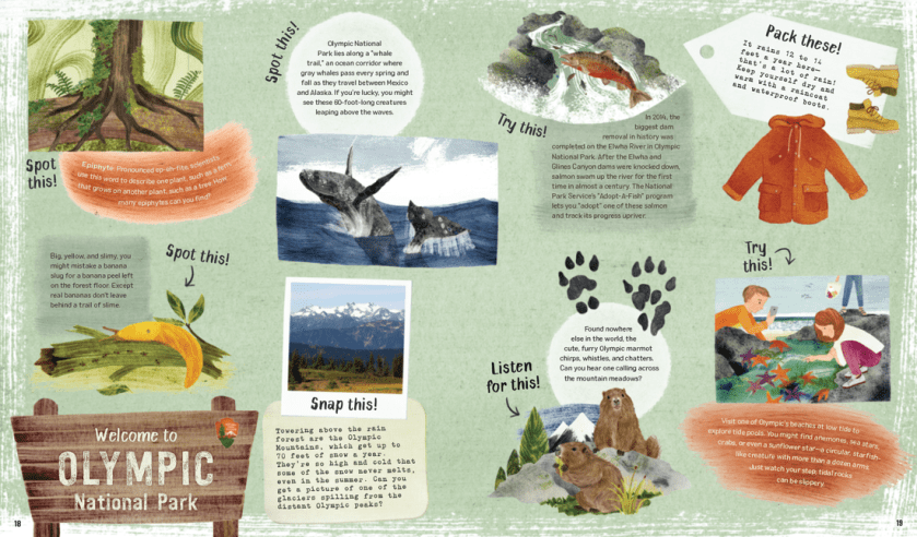 Who’s up for a road trip? This voyage through America’s 61 National Parks will have readers ready to pack their backpacks and head out with this book as their guide. Beautifully illustrated, laid out by geographic region (West Coast, Alaska, Rocky Mountains, Southwest, Central, East, and Tropics), and with a strong message of environmental respect and care, this is a treasure trove. United States maps highlight each region and its parks; a descriptive paragraph on states covered and activities to discover entices readers to turn the pages and dive in. Fact files give the statistics for each park, including size, state, founding date, and one fun fact; ranger tips help readers plan for a safe and exciting visit. Want to help scientists estimate how many bears live in Denali? Want to learn where the best place is to listen for the Mexican spotted owl? You’ll find all the answers in here. Armchair explorers and travelers, natural world fans, anyone who loves NatGeo books. Need a program idea? Take virtual tours through each of the parks using this book as your guide.