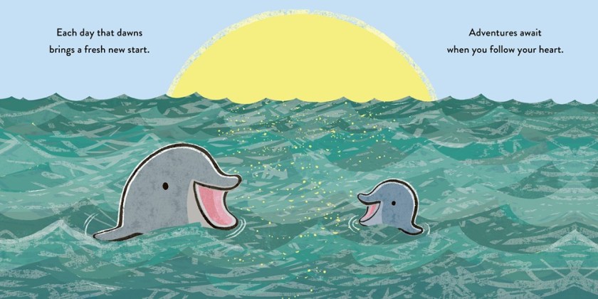 Emma Dodd’s books provide some of the coziest readalouds. Dodd’s omniscient narrator stands in for parents and caregivers who want their littles to follow their hearts and find joy while wondering where their decisions will take them: “Will you follow the crowd / and join in the fun, / leaping and laughing / as you play in the sun? / Will you be by yourself / and go it alone, / taking some time / to explore on your own?” As a dolphin parent and child swim through foil-enhanced waters, they encounter rough waters and warm sunlight; the parent dolphin also assuages any fears by letting them know they can always stay by their side if the world feels too big for them. It’s a story about letting go and seeing baby take first steps; letting go and seeing your bigger kid ride their first two wheeler; letting go and seeing your children growing up, while always letting them know you’re there for them. A very sweet addition to storytime collections; children will enjoy Dodd’s animal parent and baby dolphin, and the foil enhancements on spreads and the cover add interest.