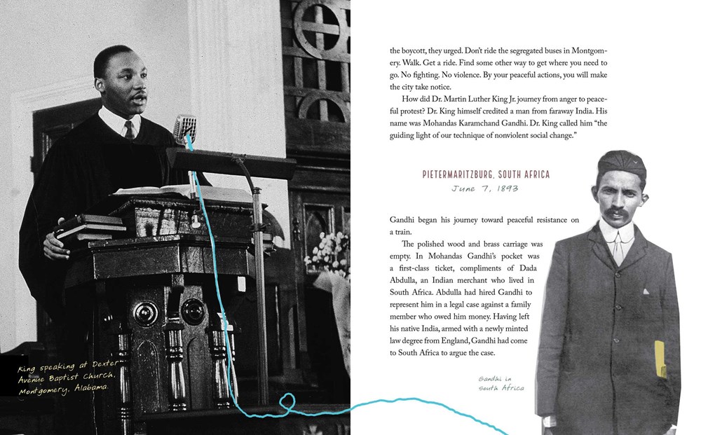 Threads of Peace: How Mohandas Gandhi and Dr. Martin Luther King Changed the World has starred reviews from Kirkus and Booklist. Display and booktalk to your middle school/early high schoolers along with Todd Hasak-Lowy’s We Are Power: How Nonviolent Activism Changes the World and Protest! : How People Have Come Together to Change the World by Emily Haworth-Booth and Alice Haworth-Booth. Unleashing Readers has some suggested questions for discussion.