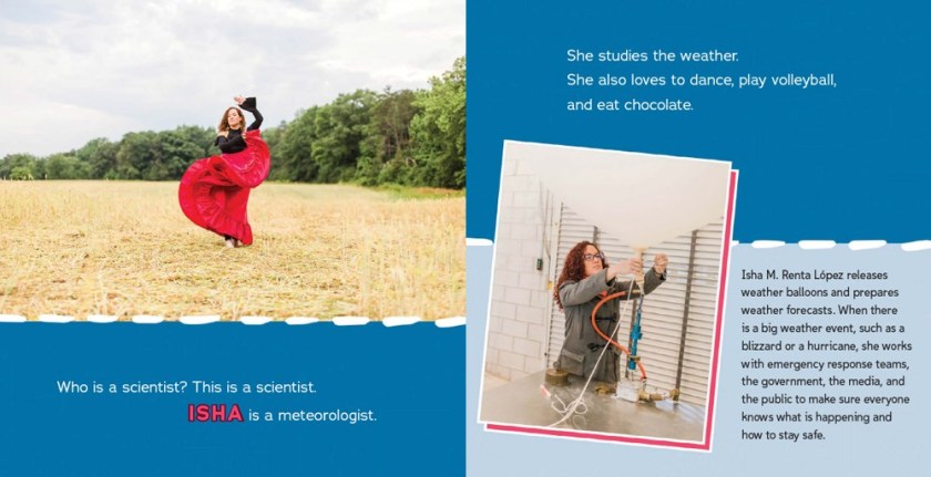 Scientists are people, too! Who Is a Scientist? humanizes the science providers by providing profiles on 14 different scientists; who they are, what they study and do, and what they like to do when they’re not science-ing. Isha is a meteorologist who studies the weather, and also enjoys dancing, playing volleyball, and eating chocolate. She’s photographed dancing in a flowing red skirt on one page and operating a weather balloon on another. Names appear in bright colors to personalize each scientist, and fun photos like Isha’s show readers that scientists like karate, surfing, cooking, and painting: just like they do. Each descriptive paragraph explains what the scientists study, introducing them to fields like astronomy, neuroscience, and mechanical engineering. The group is diverse, and really encourages kids to see themselves in this book, offering a QR code to learn more about the scientists, and a flow chart to help guide readers to a field of study that may be right for them, based on their own interests. What a great way to inspire the next generation of scientists, right? Who Is a Scientist? makes science playful and fun, like it should be. A guide to phonetic pronunciations at the end of the book help readers learn to pronounce Laura Gehl’s name, and the names of each scientist.